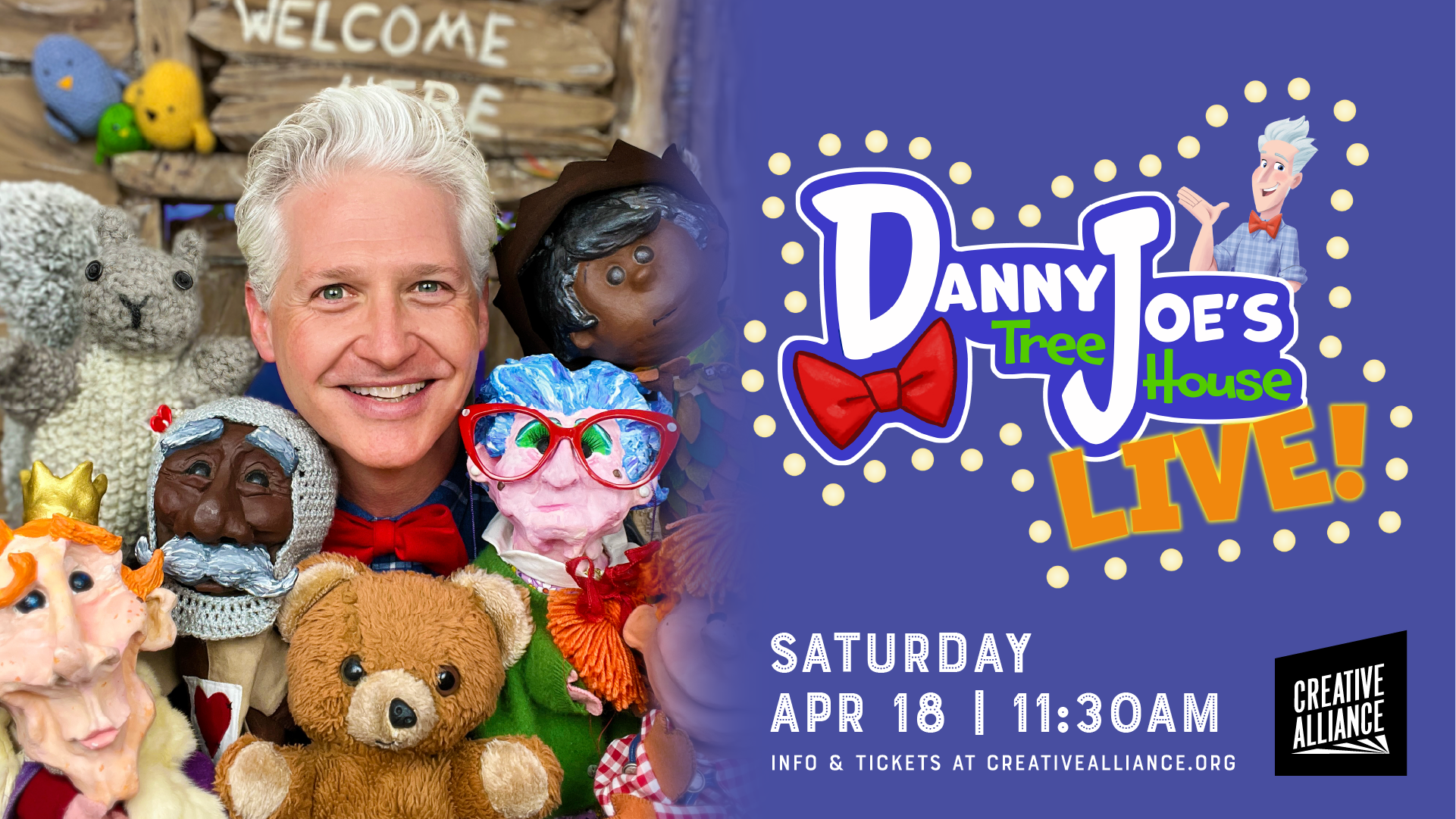 Hey Baltimore! Come on down to the Creative Alliance on Saturday, April 18 at 11:30am for Danny Joe’s Tree House Live! Doors open at 11am. This stage version of the award-winning streaming children’s series will feature Danny Joe and his puppet pals: Teddy Bear, Kingsley, Pixie Bell, the Good Knight Sweetheart, Tweet, Peep, and Sweety, along with a zany cast of characters, including the musical Mister Maestro, and a surprise guest from the future!