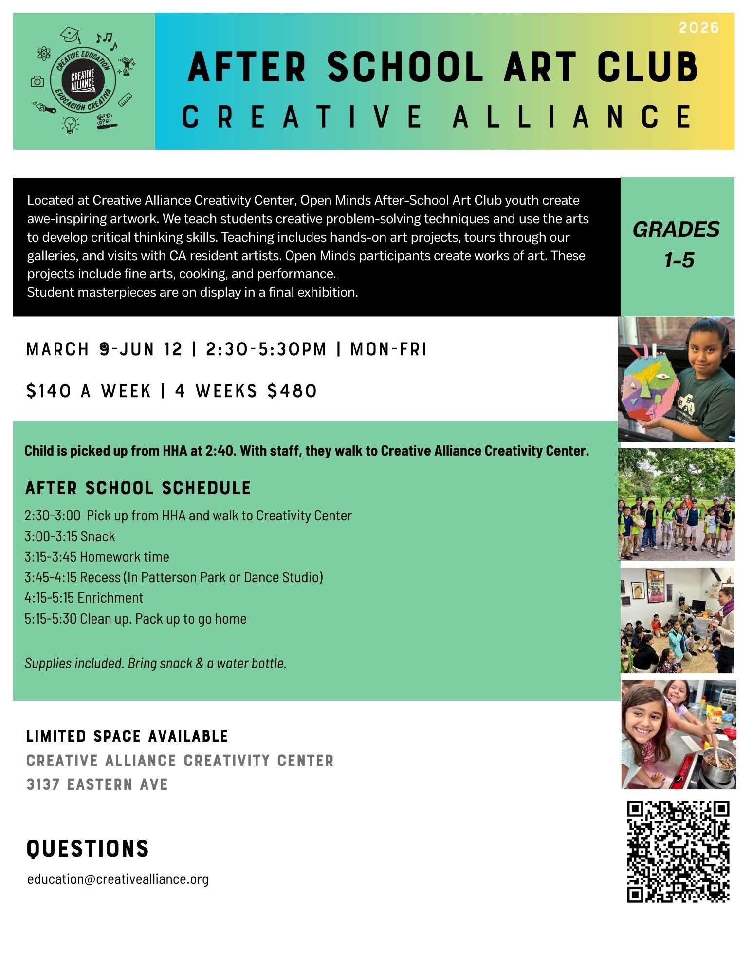 Located at Creative Alliance Creativity Center, Open Minds After-School Art Club youth create awe-inspiring artwork. We teach students creative problem-solving techniques and use the arts to develop critical thinking skills. Teaching includes hands-on art projects, tours through our galleries, and visits with CA resident artists. Open Minds participants create works of art. These projects include fine arts, cooking, and performance.