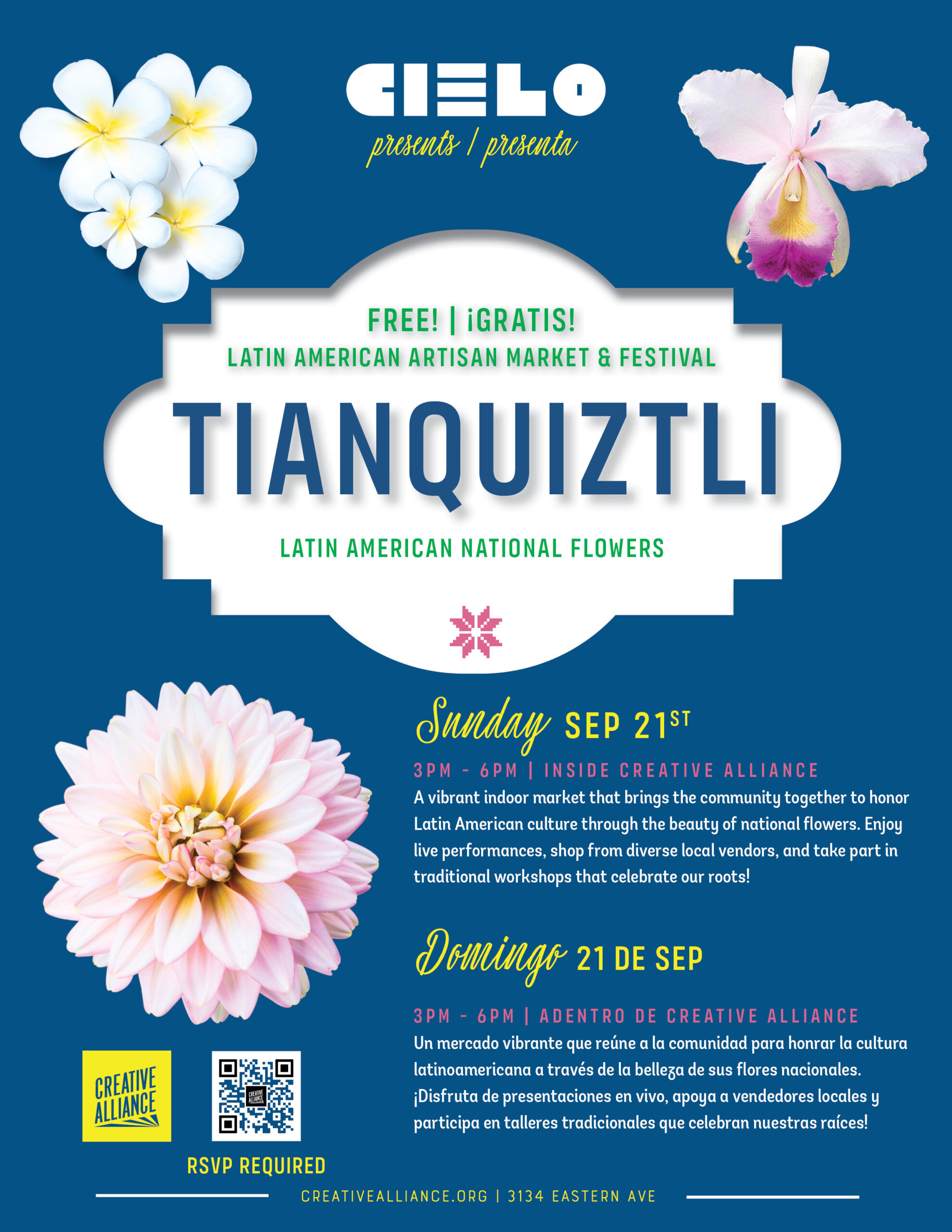Un mercado vibrante que reúne a la comunidad para honrar la cultura latinoamericana a través de la belleza de sus flores nacionales. ¡Disfruta de presentaciones en vivo, apoya a vendedores locales y participa en talleres tradicionales que celebran nuestras raíces!